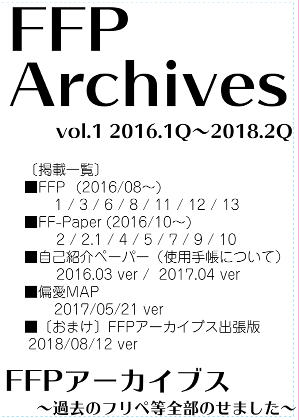 過去発行のフリーペーパー、ならびに、オフ会や通販・即売会(購入者のみ)限定で配布したペーパー2年分ほぼ全部を縮刷版掲載しました。 また、このために新規でもう1ページ書きました(FFP・アーカイブス出張版)