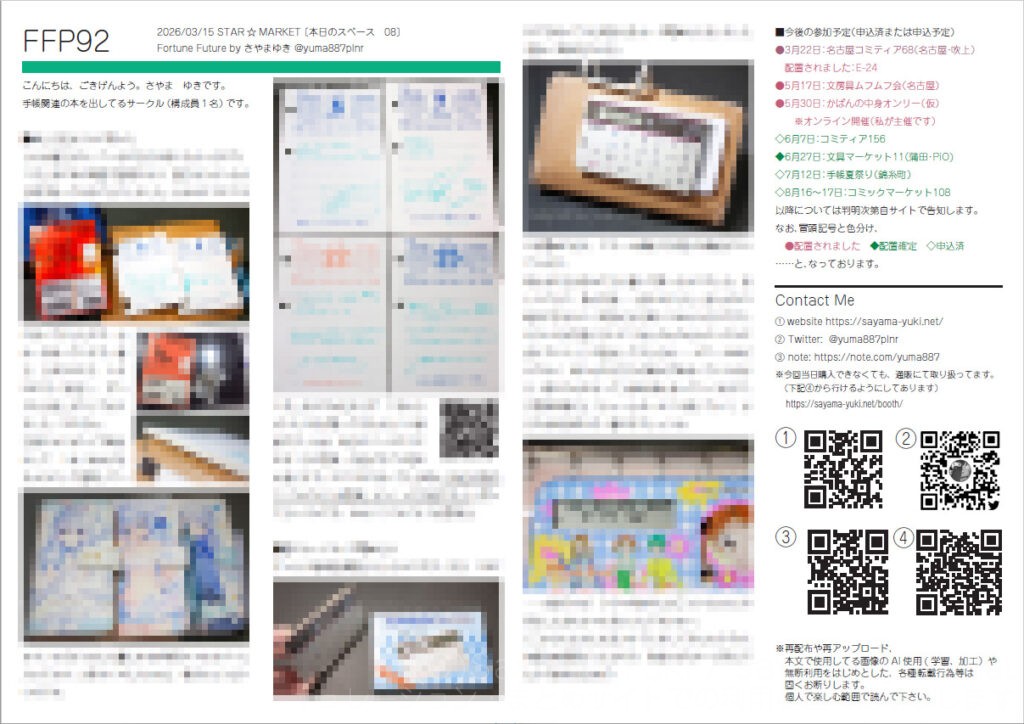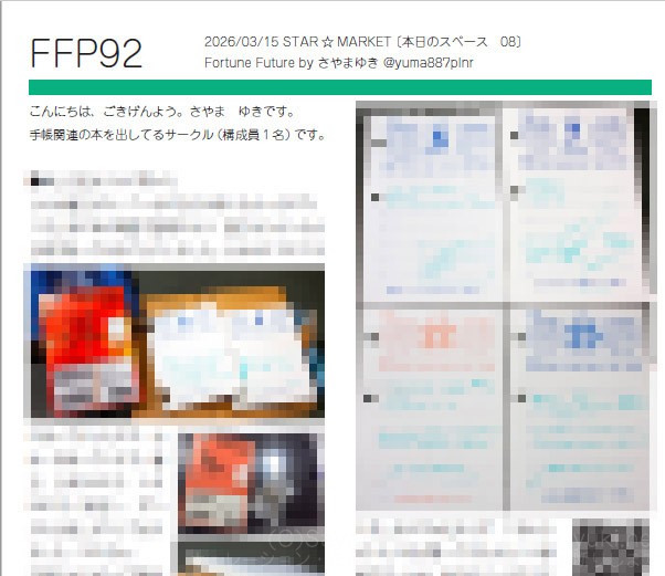出来ました。3月15日のSTAR☆MARKETにて配布いたしましたフリペです。 ダウンロードこちらからです。転載、各種無断利用は固くお断りします。 投稿ナビゲーション 【業務連絡用】2026/2/21文具マーケット終了後の「手帳・文具好き」の集まり(要はアフター)開催について